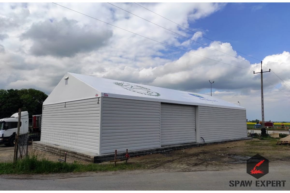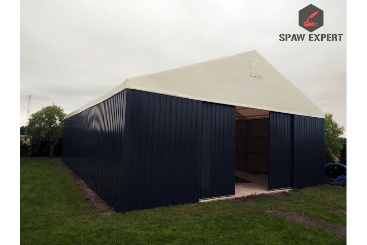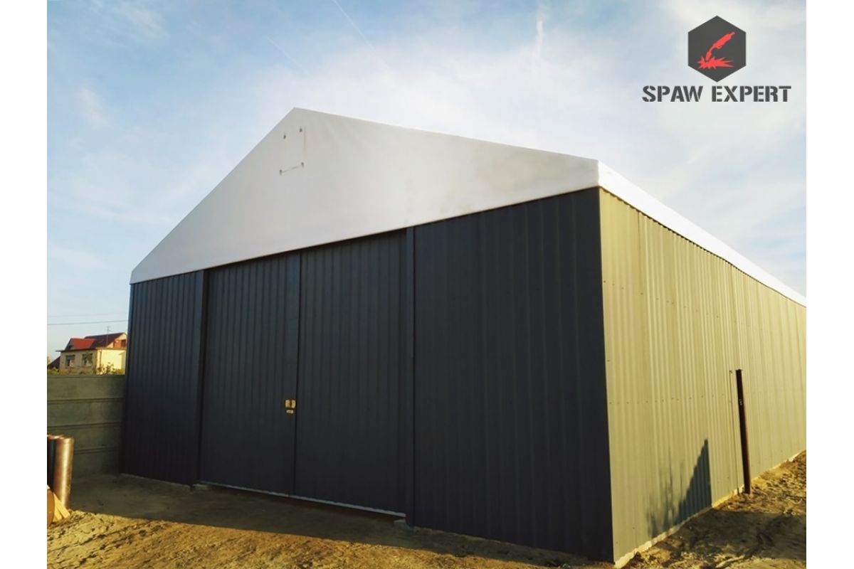 Dach hali wykonujemy z materiału namiotowego (PCV), materiału namiotowego trudno zapalnego (ITB), blachy trapezowej, płyty warstwowej lub dach pompowany – termoizolacyjny.